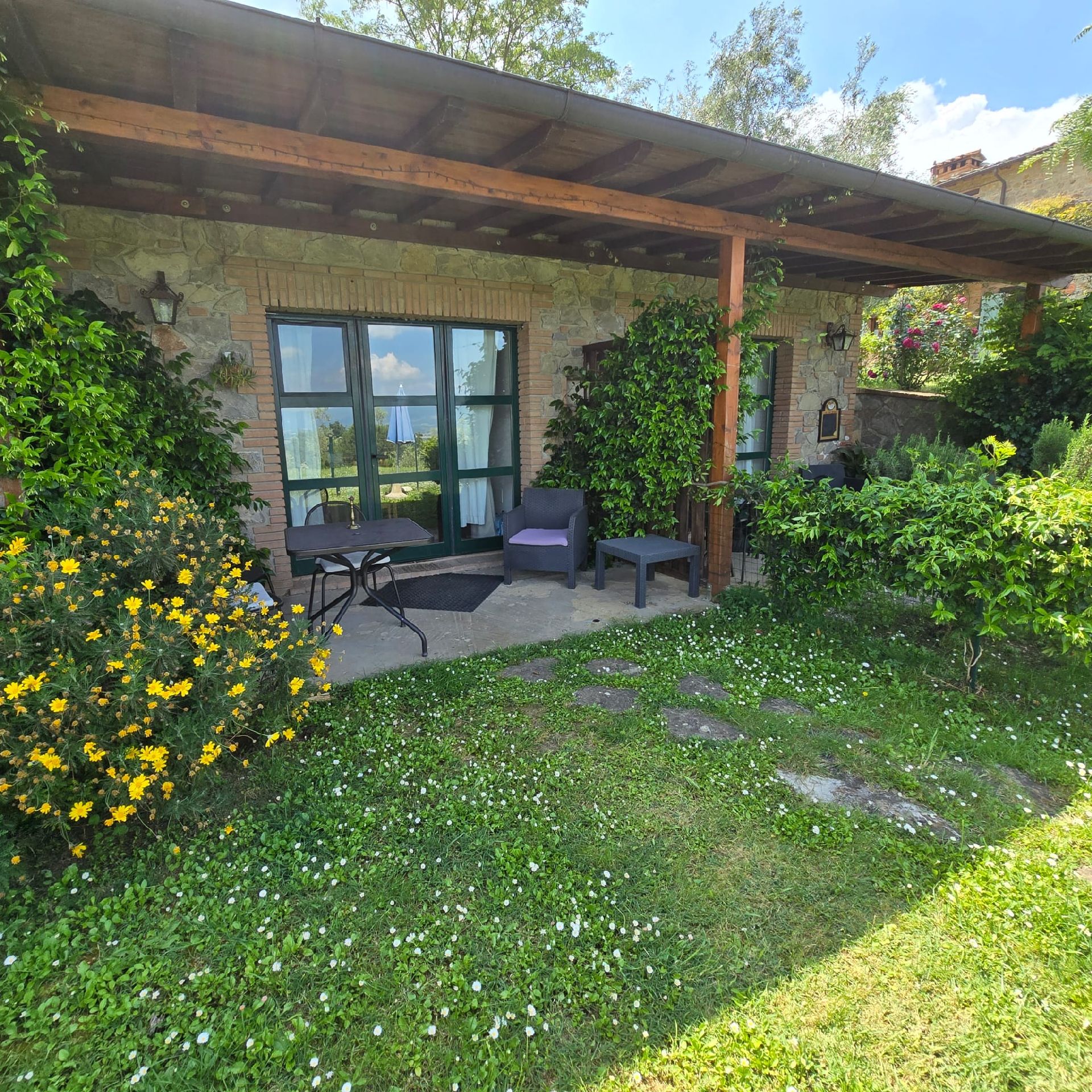 – giardino esterno panoramico con tavolo e divanetto